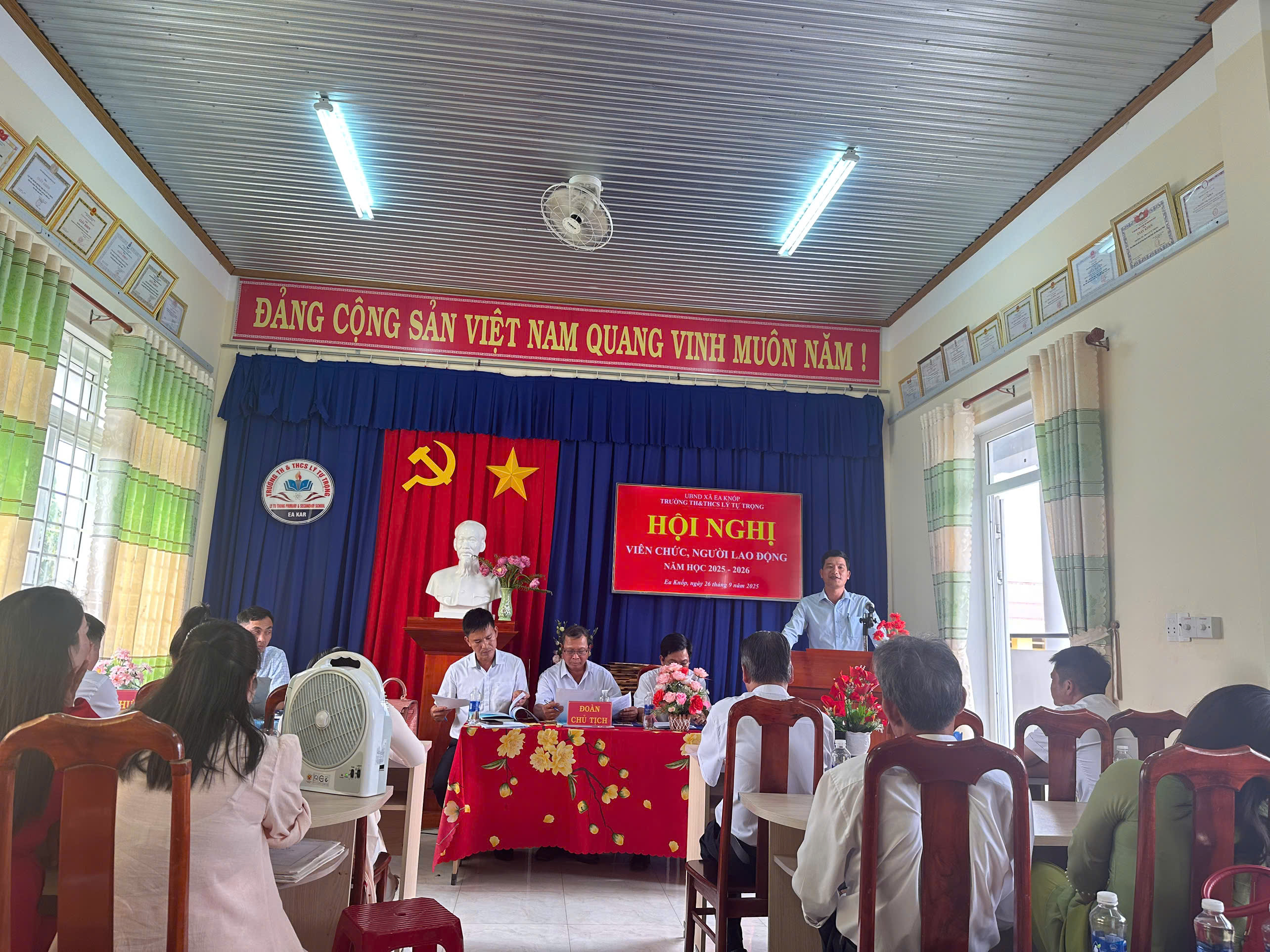 Dự Hội nghị có đông đủ cán bộ giáo viên, nhân viên nhà trường. Hội nghị chú ý lắng nghe đồng chí Vũ Đức Thuân – Hiệu trưởng nhà trường thông qua báo cáo kiểm điểm việc thực hiện nghị quyết hội nghị viên chức, người lao động năm học 2024-2025; phương hướng, nhiệm vụ năm học 2025- 2026.